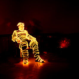 Eine sitzende Person im Sessel vor Kamin. Entstanden ist dieses Billd beim Lightpaintingfestival 2022 in Harzgerode